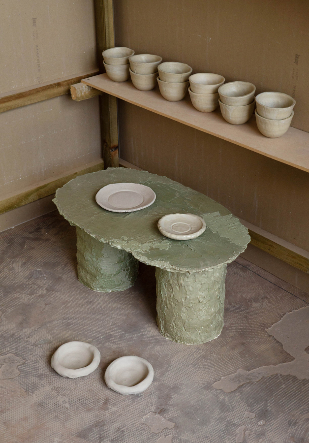 C’est au détour des cours du soir aux Beaux-Arts que j’ai été amenée à tenter les concours en écoles d’art. Je suis arrivée à la Haute École des Arts du Rhin avec l’envie de me spécialiser en design. Au cours des premières années, j’ai choisi une section nommée Design Process, où l’objet final importait peu, mais où le processus primait sur la forme. J’ai testé plein de matières et de matériaux, et j’ai compris que le rapport à la roche, à la matière brute, était le médium que je souhaitais explorer. En parallèle, j’ai commencé à écrire mon mémoire. Très vite, le moment du repas est devenu mon terrain de jeu. J’aime ce que la table raconte : le rapport nourricier, la convivialité, le paysage, le partage, l’esthétique, l’utilité. La table est un endroit de prise de décisions. C’est assez naturellement que je me suis donc tournée vers la céramique.
